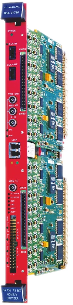 The module features front panel Clock Input and Output as well as a PLL for clock synthesis from internal/external references. The data stream is continuously written in a circular memory buffer. When the trigger occurs, the FPGA writes further N samples for the post trigger and freezes the buffer that can be read either by VMEbus or Optical Link. The acquisition can continue without dead time in a new buffer.