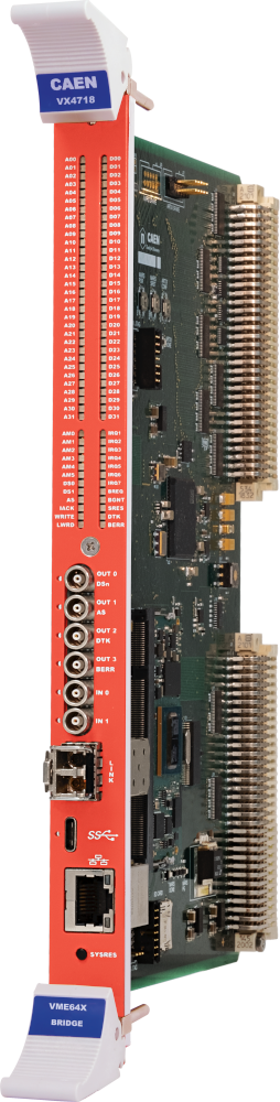 The VX4718 is CAEN New Bridge with enhanced data rate and extended interfacing capabilities, thanks to the on-board MPSoC (including an ARM processor running Linux). The board is a VME Master which can be controlled by an external PC via USB 3.0 and Gigabit Ethernet connections. Optical link interface is also available (CAEN CONET protocol). The mechanics is 1-unit wide VME 6U.