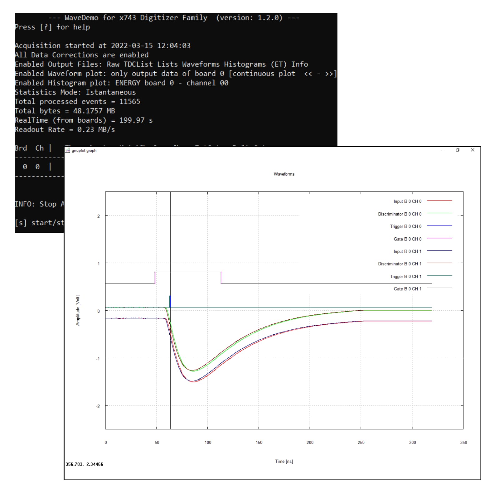 The program core is a C application that configures the digitizer, starts/stops the acquisition, and manages the data readout according to a set of parameters as reported in the configuration text file. Data (waveforms or histograms) are plotted using Gnuplot, an external plotting tool, or saved to output text files. The configuration text file can be found in the installation folder, inside the bin folder.